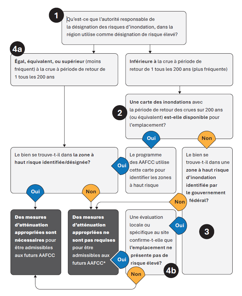 Cette section décrit les étapes à suivre pour déterminer les exigences en matière d'atténuation appropriée dans les zones à risque élevé d'inondation afin de maintenir l'admissibilité au programme des AAFCC. Cela s'applique aux biens construits après le 1er avril 2025 et aux biens qui subissent des dommages importants au cours d'une catastrophe admissible aux AAFCC. Les étapes sont présentées à la fois sous forme de diagramme et sous forme écrite.