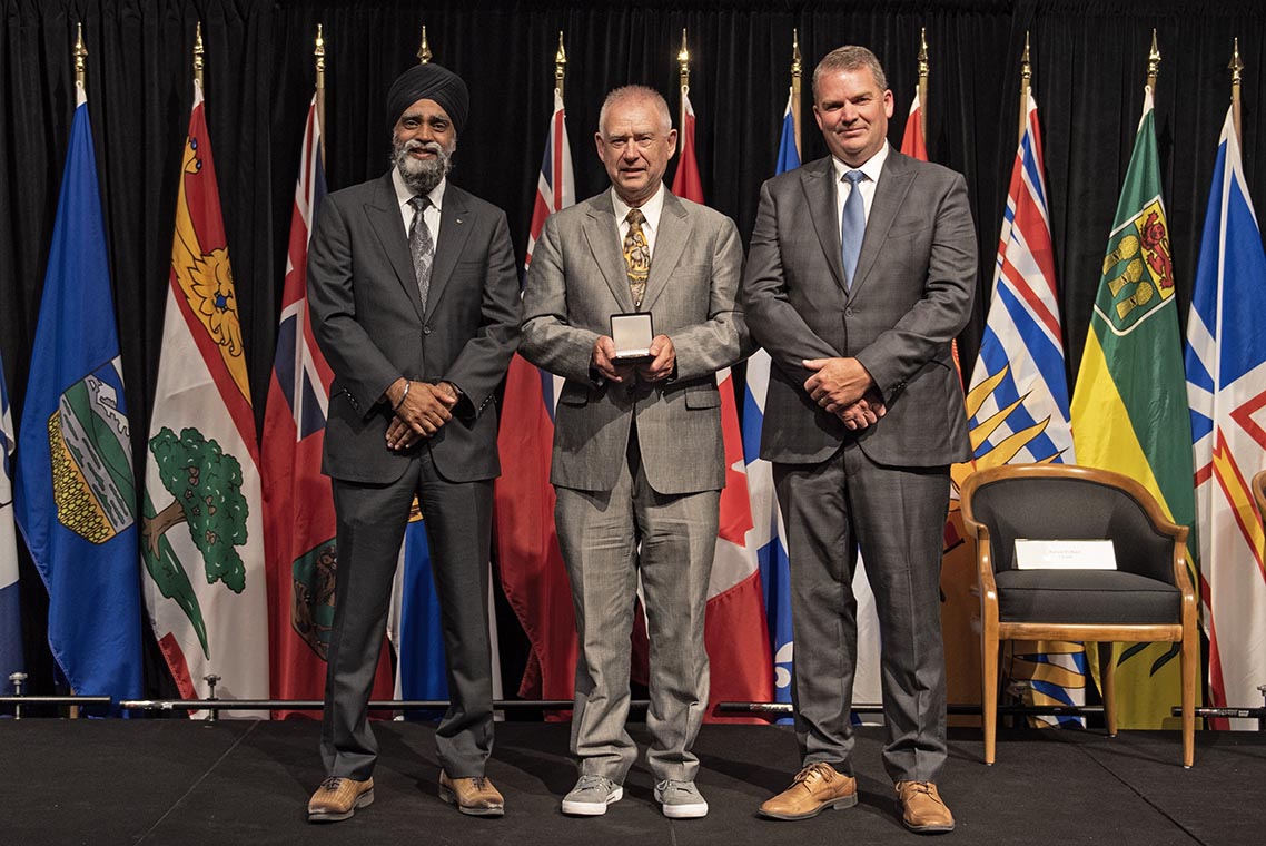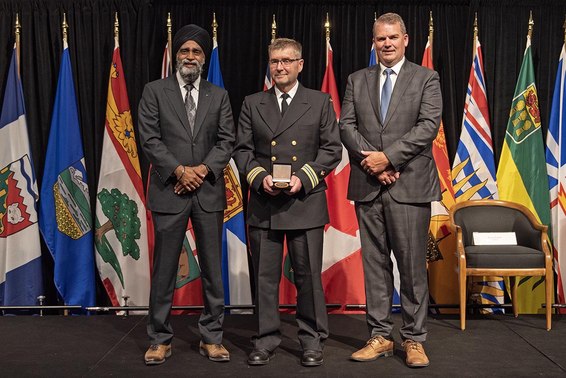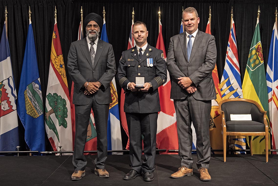 L'honorable Harjit S. Sajjan, président du Conseil privé du roi pour le Canada, ministre de la Protection civile et ministre responsable de l'Agence de développement économique du Pacifique du Canada (à l'extrême gauche), et l'honorable Bloyce Thompson, vice-premier ministre, procureur général, ministre de la Justice et de la Sécurité publique, Île-du-Prince-Édouard (à l'extrême droite) sont photographiés en compagnie du lauréat 2022 du Prix pour service exemplaire en sécurité civile pour la catégorie de recherche et sauvetage.