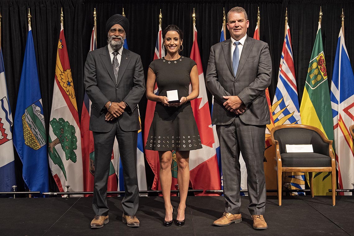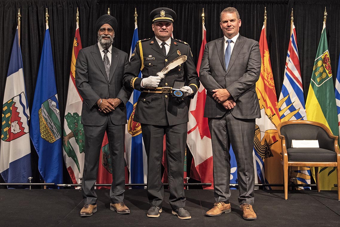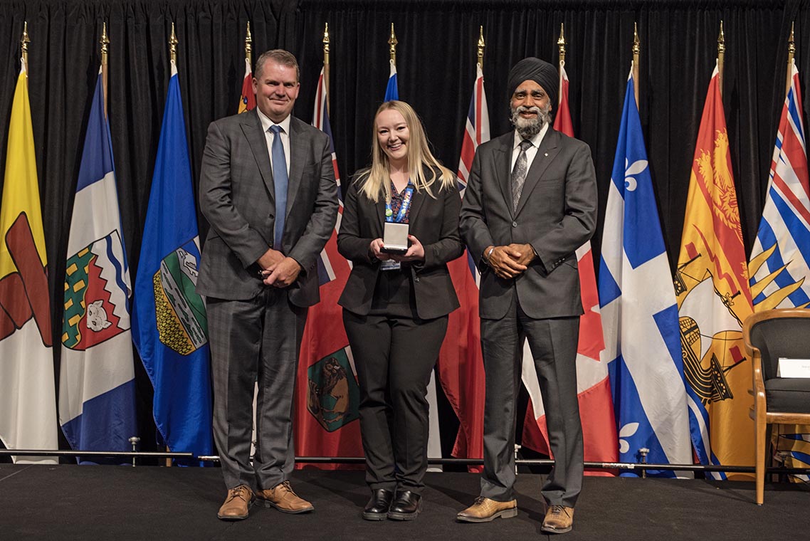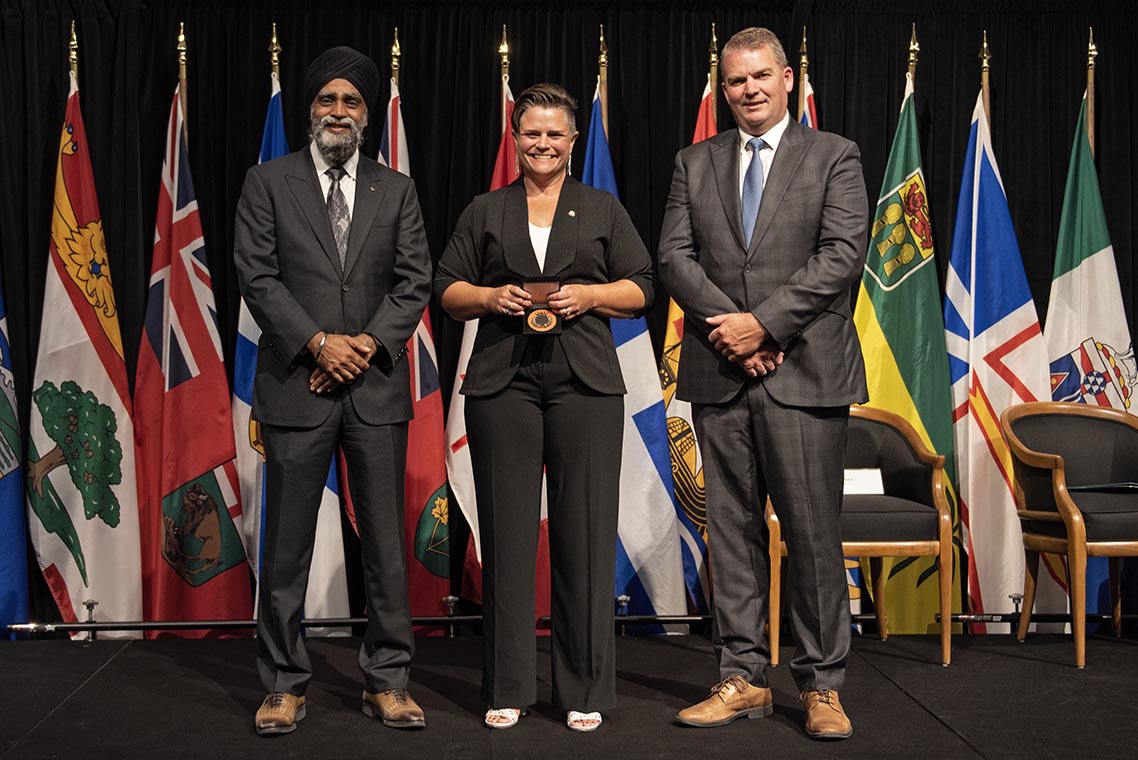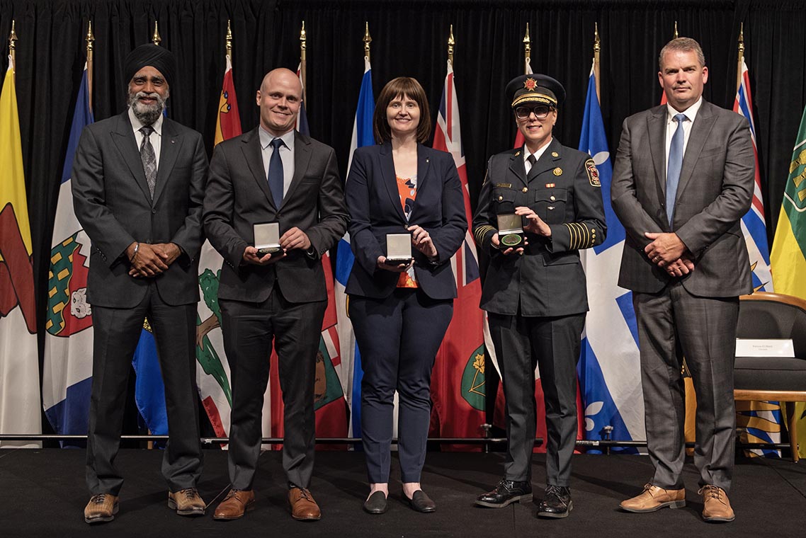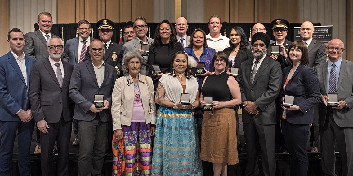 L'honorable Harjit S. Sajjan, président du Conseil privé du roi pour le Canada, ministre de la Protection civile et ministre responsable de l'Agence de développement économique du Pacifique du Canada, et l'honorable Bloyce Thompson, vice-premier ministre, procureur général, ministre de la Justice et de la Sécurité publique, Île-du-Prince-Édouard sont photographiés en compagnie des lauréats 2022 du Prix pour service exemplaire en sécurité civile.