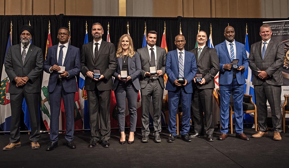 L'honorable Harjit S. Sajjan, président du Conseil privé du roi pour le Canada, ministre de la Protection civile et ministre responsable de l'Agence de développement économique du Pacifique du Canada (à l'extrême gauche), et l'honorable Bloyce Thompson, vice-premier ministre, procureur général, ministre de la Justice et de la Sécurité publique, Île-du-Prince-Édouard (à l'extrême droite) sont photographiés en compagnie des lauréats 2022 du Prix pour service exemplaire en sécurité civile pour la catégorie de contribution remarquable à la gestion des urgences.
