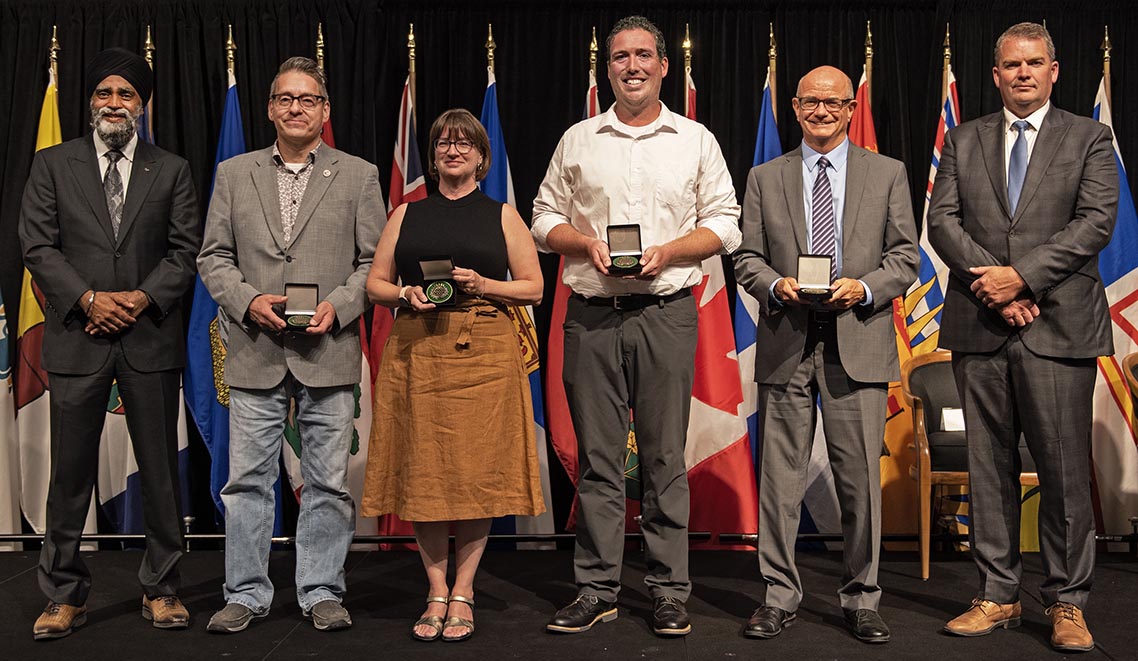 L'honorable Harjit S. Sajjan, président du Conseil privé du roi pour le Canada, ministre de la Protection civile et ministre responsable de l'Agence de développement économique du Pacifique du Canada (à l'extrême gauche), et l'honorable Bloyce Thompson, vice-premier ministre, procureur général, ministre de la Justice et de la Sécurité publique, Île-du-Prince-Édouard (à l'extrême droite) sont photographiés en compagnie du lauréat 2022 du Prix pour service exemplaire en sécurité civile pour la catégorie des communautés résilientes.