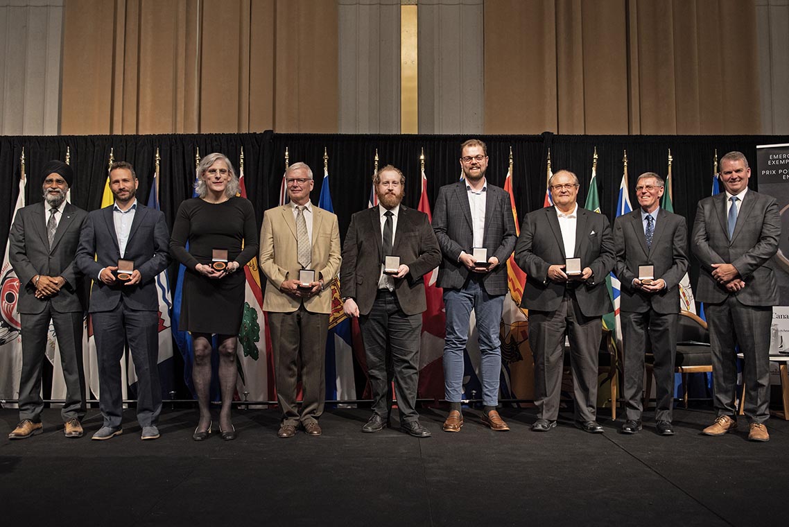 L'honorable Harjit S. Sajjan, président du Conseil privé du roi pour le Canada, ministre de la Protection civile et ministre responsable de l'Agence de développement économique du Pacifique du Canada, et l'honorable Bloyce Thompson, vice-premier ministre, procureur général, ministre de la Justice et de la Sécurité publique, Île-du-Prince-Édouard sont photographiés en compagnie des lauréats 2022 du Prix pour service exemplaire en sécurité civile pour la catégorie de contribution remarquable à la gestion des urgences.