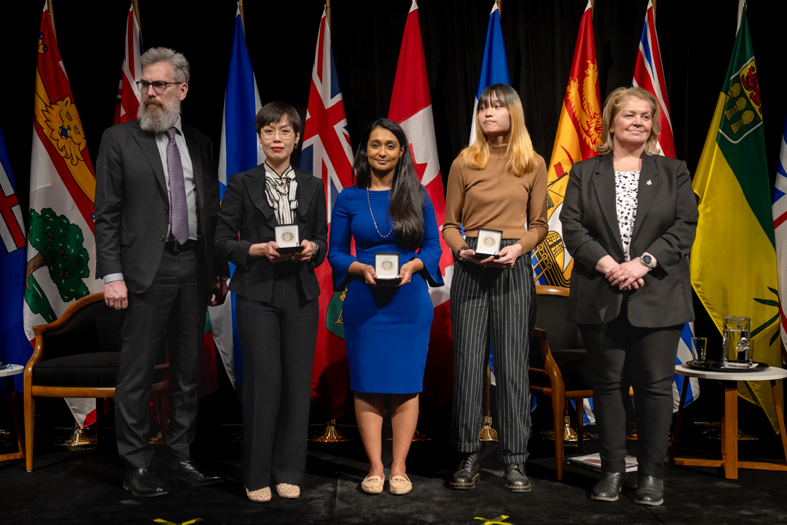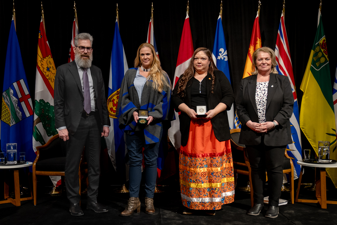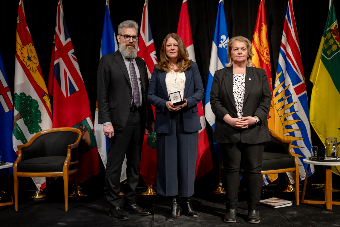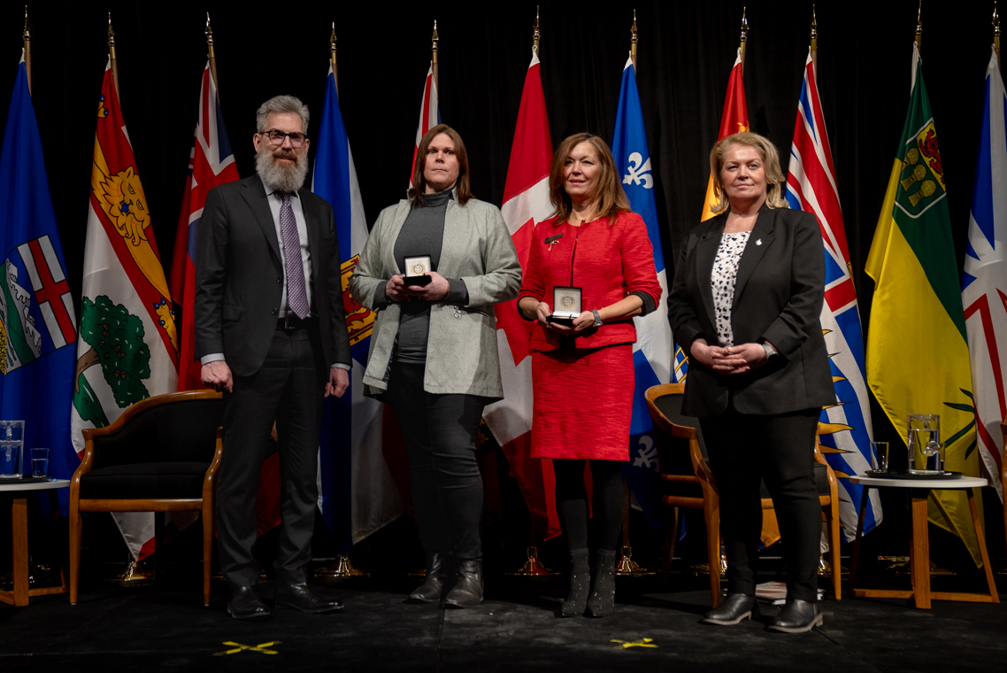 L'honorable Harjit S. Sajjan, président du Conseil privé du roi pour le Canada, ministre de la Protection civile et ministre responsable de l'Agence de développement économique du Pacifique du Canada et Sherry Romanado, secrétaire parlementaire du président du Conseil privé du Roi pour le Canada et ministre de la Protection civile sont photographiés en compagnie du lauréat 2024-2025 du Prix pour service exemplaire en sécurité civile pour la catégorie des communautés résilientes.