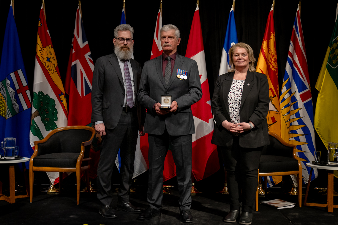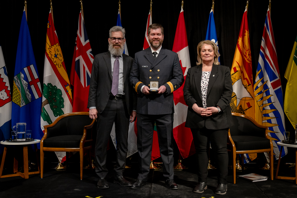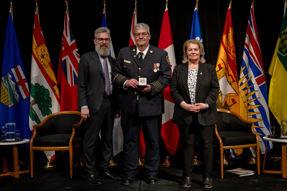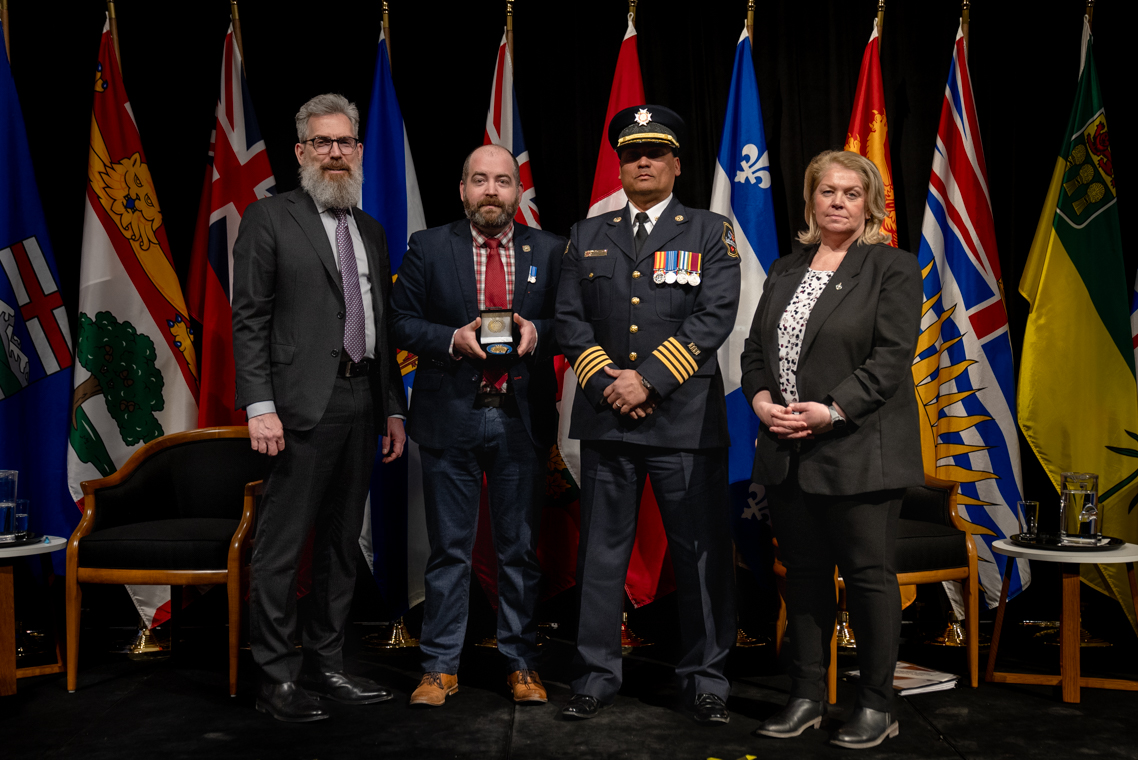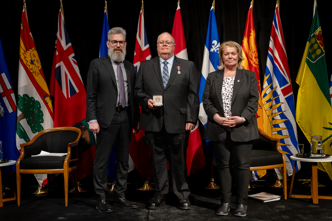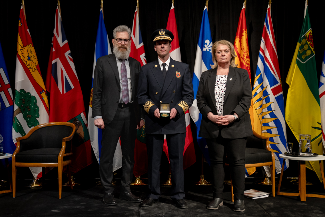 L'honorable Harjit S. Sajjan, président du Conseil privé du roi pour le Canada, ministre de la Protection civile et ministre responsable de l'Agence de développement économique du Pacifique du Canada et Sherry Romanado, secrétaire parlementaire du président du Conseil privé du Roi pour le Canada et ministre de la Protection civile sont photographiés en compagnie du lauréat 2024-2025 du Prix pour service exemplaire en sécurité civile pour la catégorie en recherche et sauvetage.