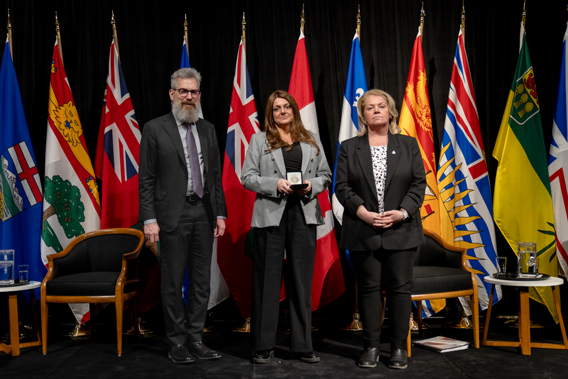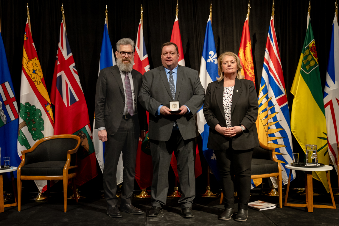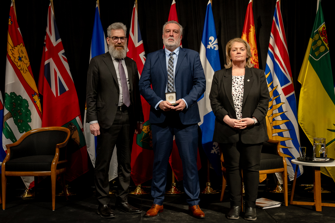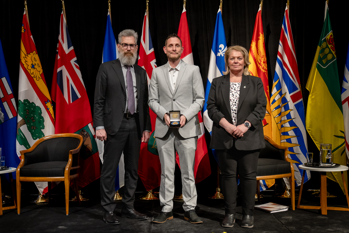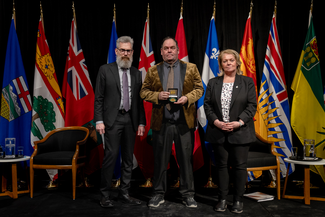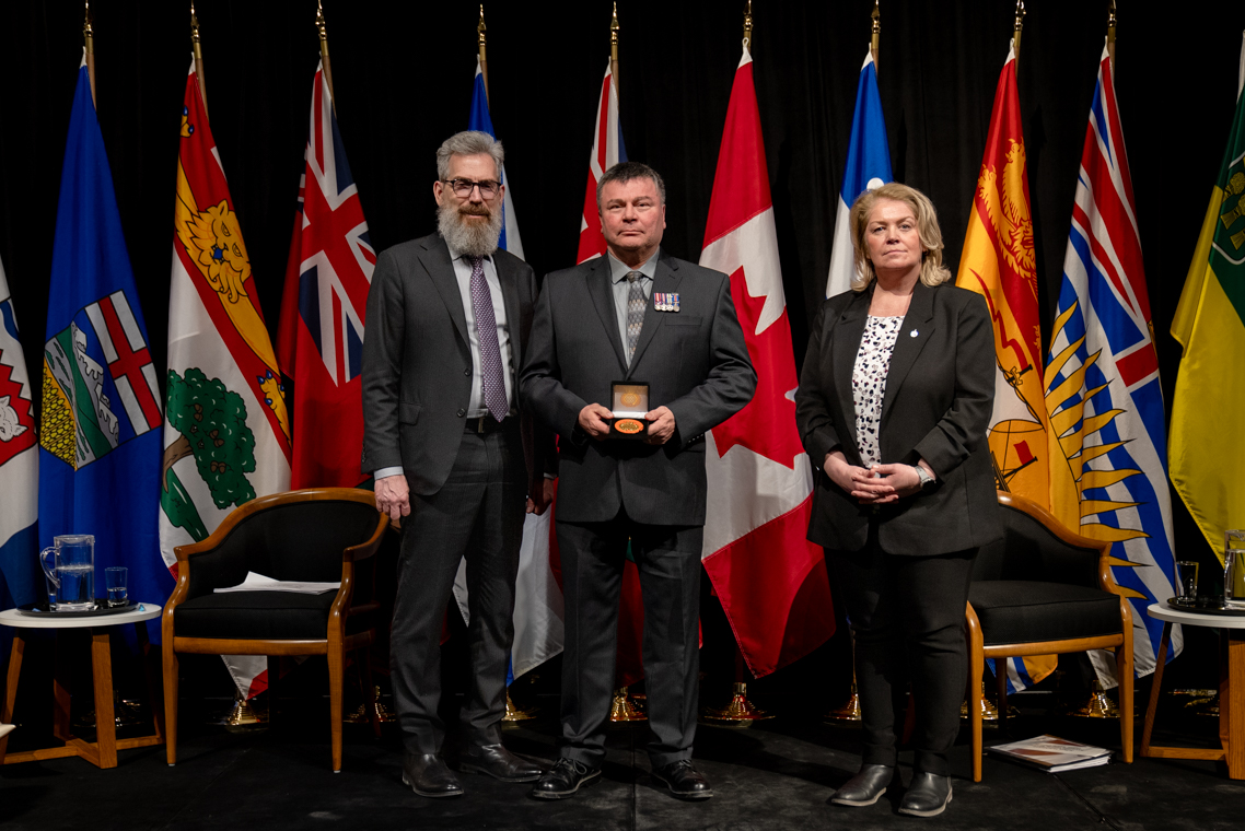 L'honorable Harjit S. Sajjan, président du Conseil privé du roi pour le Canada, ministre de la Protection civile et ministre responsable de l'Agence de développement économique du Pacifique du Canada et Sherry Romanado, secrétaire parlementaire du président du Conseil privé du Roi pour le Canada et ministre de la Protection civile sont photographiés en compagnie du lauréat 2024-2025 du Prix pour service exemplaire en sécurité civile pour la catégorie en recherche et sauvetage.