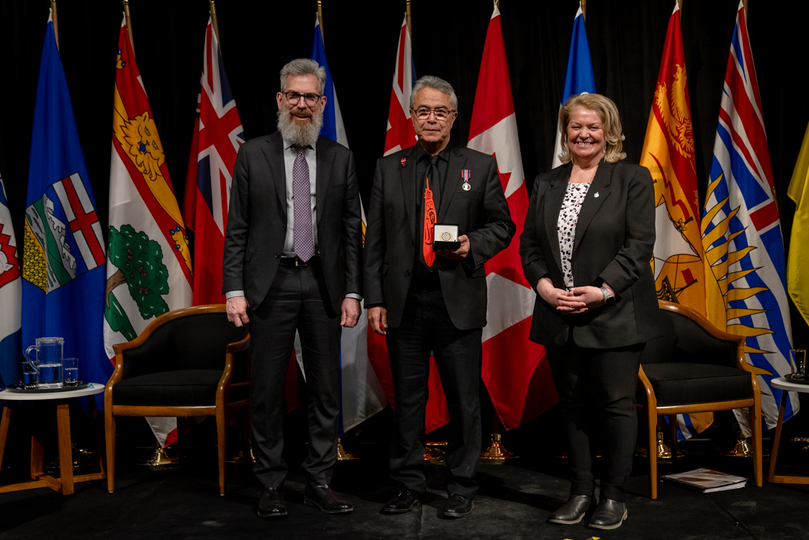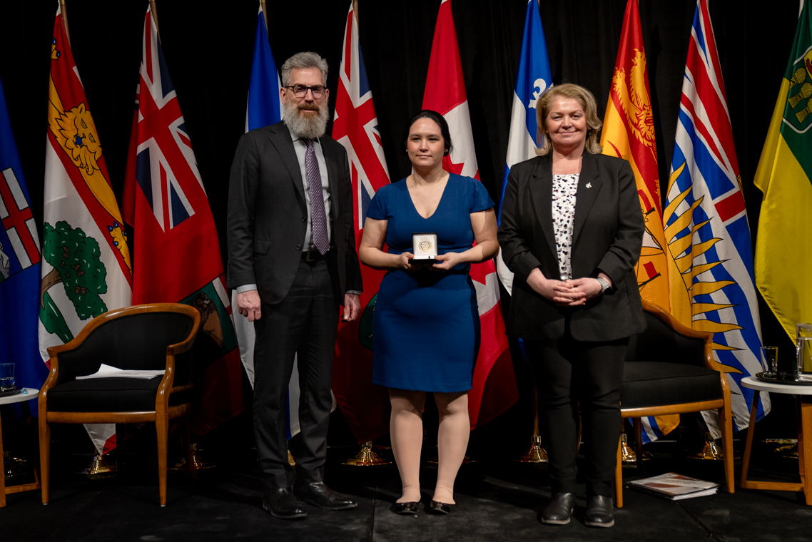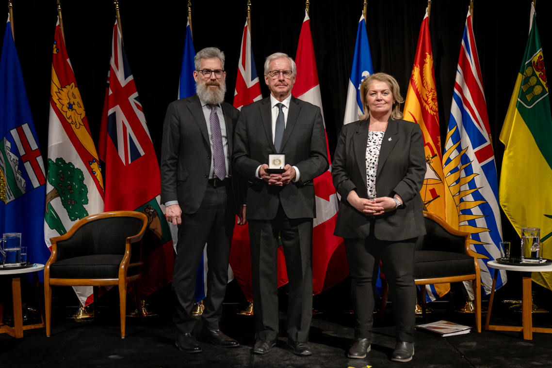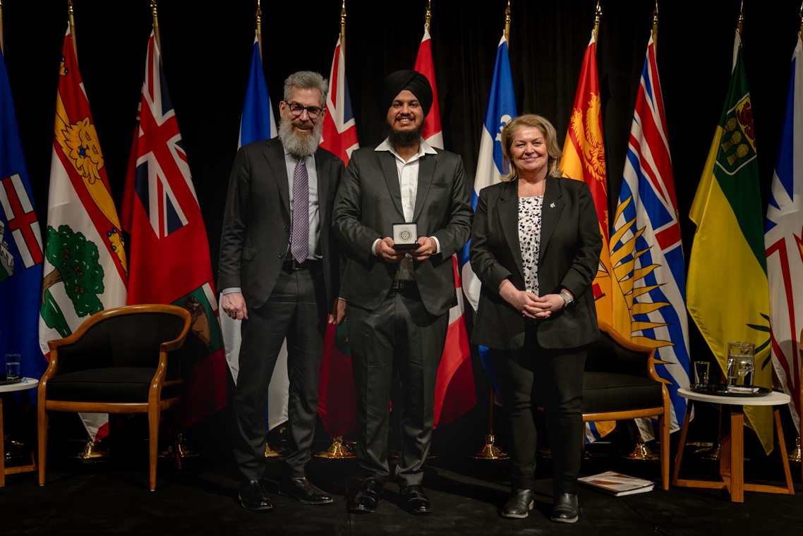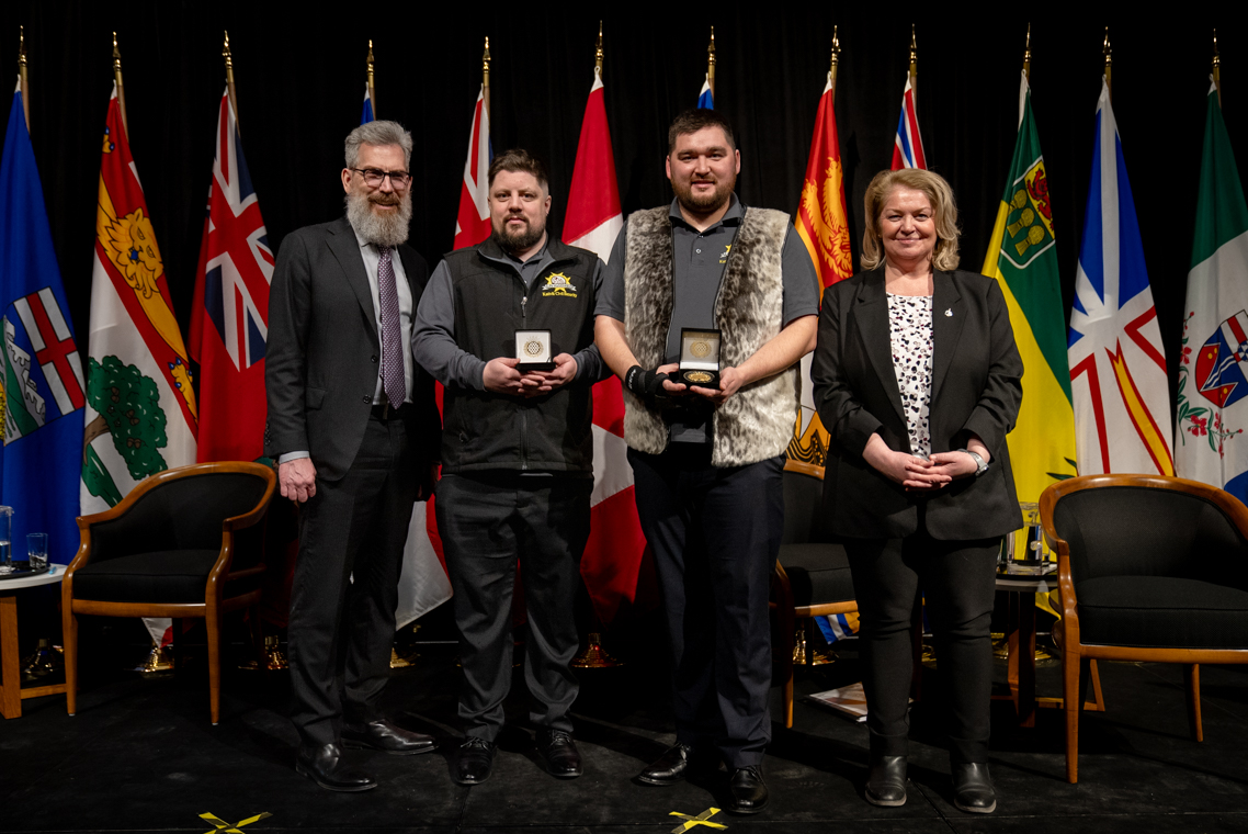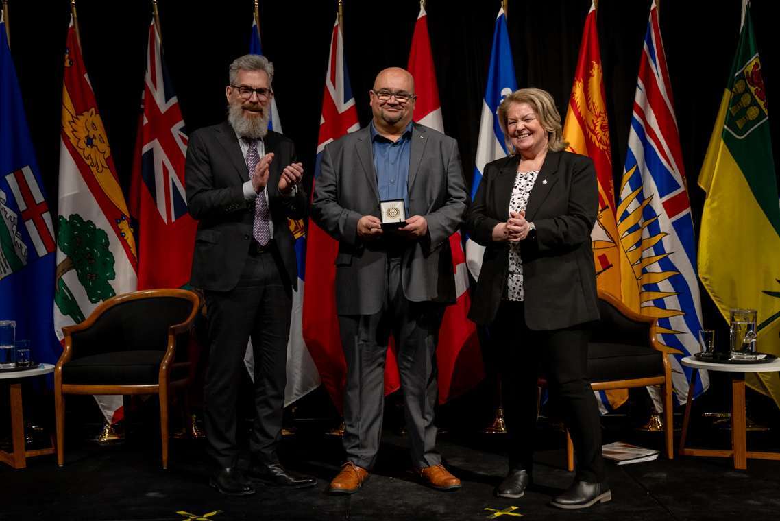 L'honorable Harjit S. Sajjan, président du Conseil privé du roi pour le Canada, ministre de la Protection civile et ministre responsable de l'Agence de développement économique du Pacifique du Canada et Sherry Romanado, secrétaire parlementaire du président du Conseil privé du Roi pour le Canada et ministre de la Protection civile sont photographiés en compagnie du lauréat 2024-2025 du Prix pour service exemplaire en sécurité civile pour la catégorie en recherche et sauvetage.