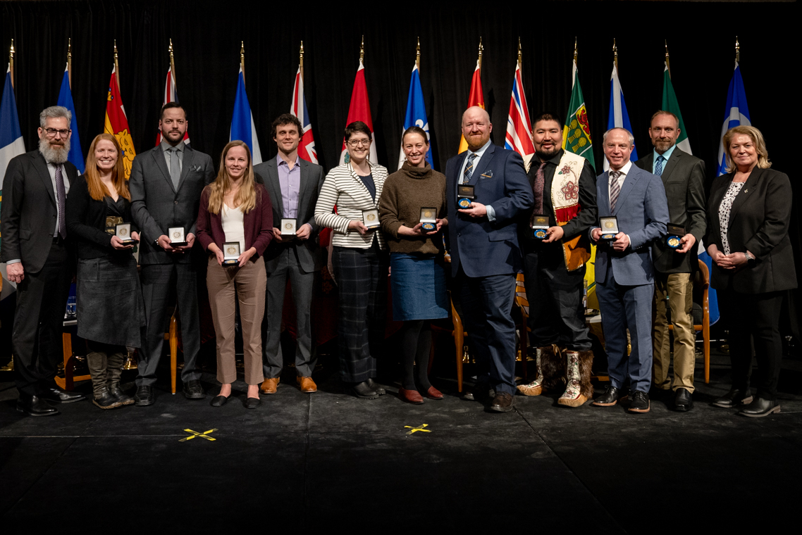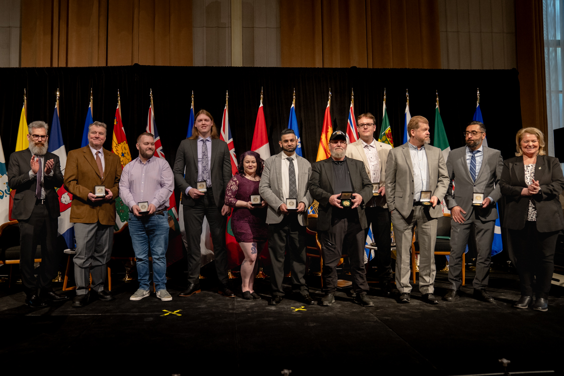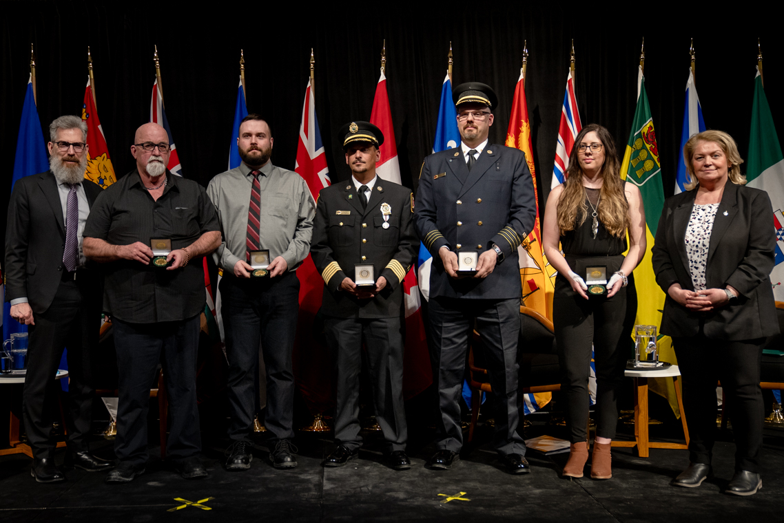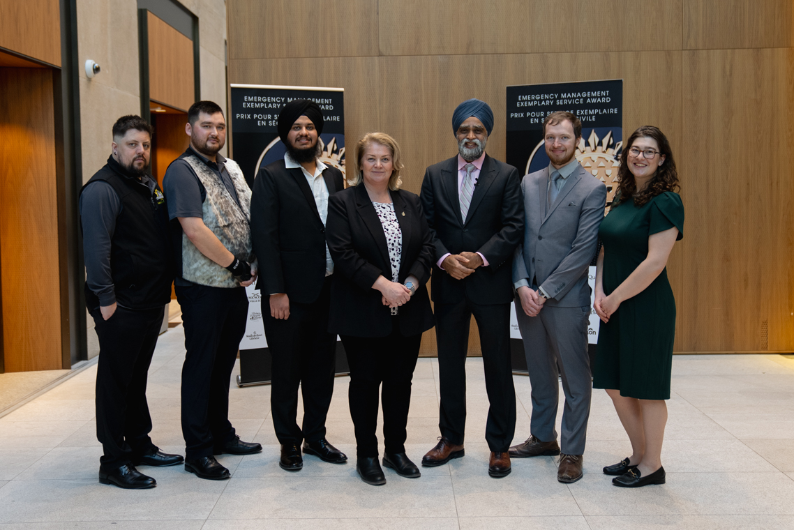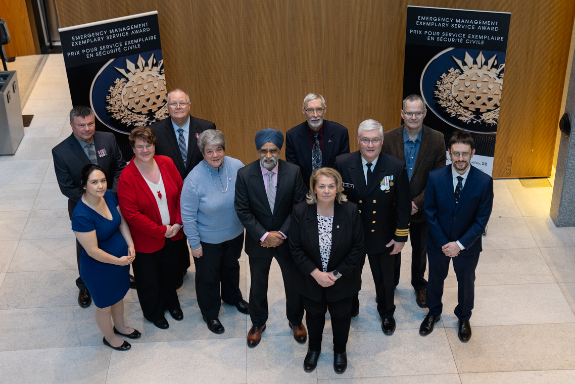 L'honorable Harjit S. Sajjan, président du Conseil privé du roi pour le Canada, ministre de la Protection civile et ministre responsable de l'Agence de développement économique du Pacifique du Canada et Sherry Romanado, secrétaire parlementaire du président du Conseil privé du Roi pour le Canada et ministre de la Protection civile sont photographiés en compagnie des lauréats 2024-2025 du Prix pour service exemplaire en sécurité civile.