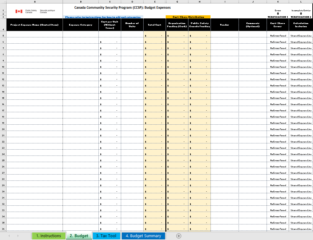 To add an expense, start with the left-most column (Column 'A' / Project Expense Name), filling the information from left to right for each expense line. If all information is present, a confirmation message "Entry Complete" will be shown in Column 'M' (Verification 2). Your cost-share for each expense is automatically calculated as 30% covered by your organization and 70% covered by Public Safety Canada. Please note that Public Safety Canada is not responsible for the maintenance of the security equipment obtained through this program and ineligible expenses will not be covered.