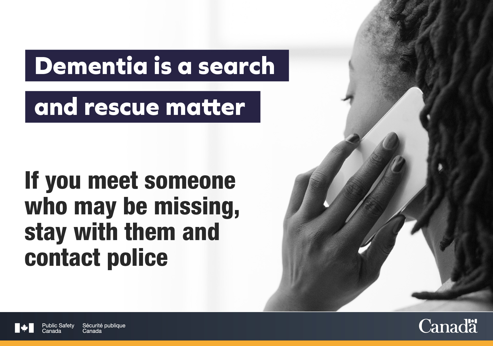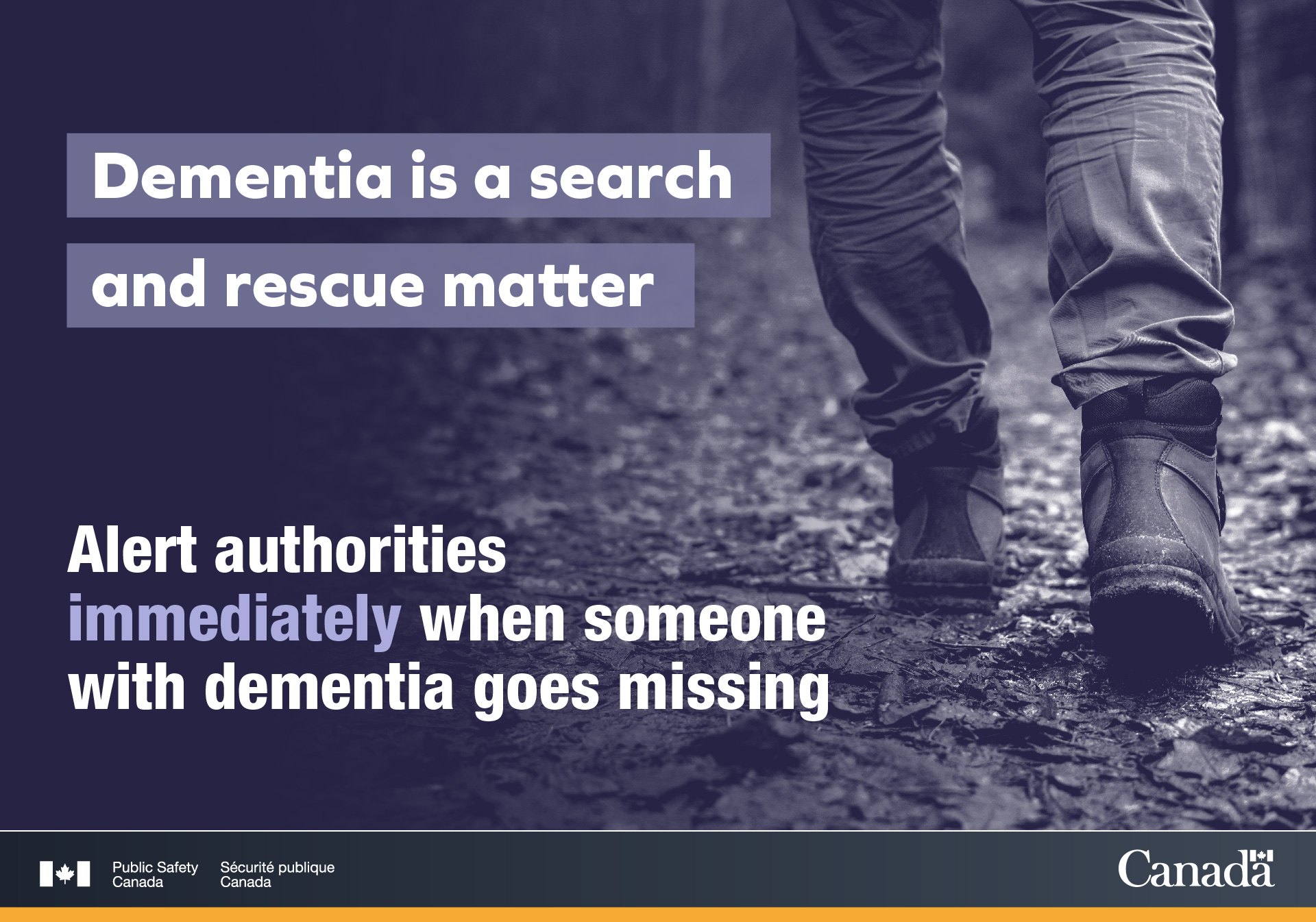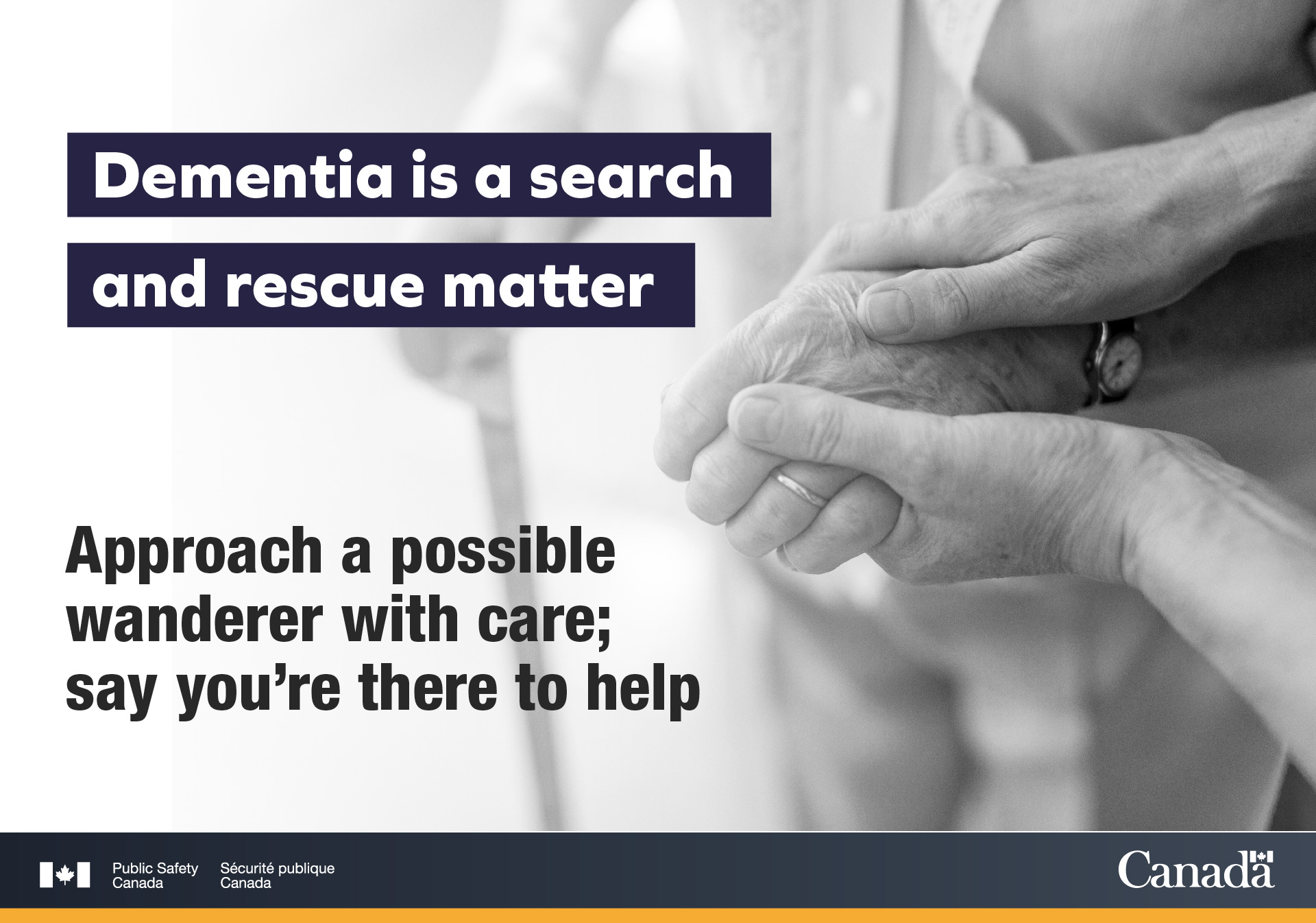 Public Safety promotes awareness about the impact of missing persons living with dementiaFootnote 1 on SAR resources on social media platforms. The approach is meant to empower members of the public to recognize a wandering person living with dementia, know how to approach them and call for help. The following downloadable graphics are available for you to use to do the same.