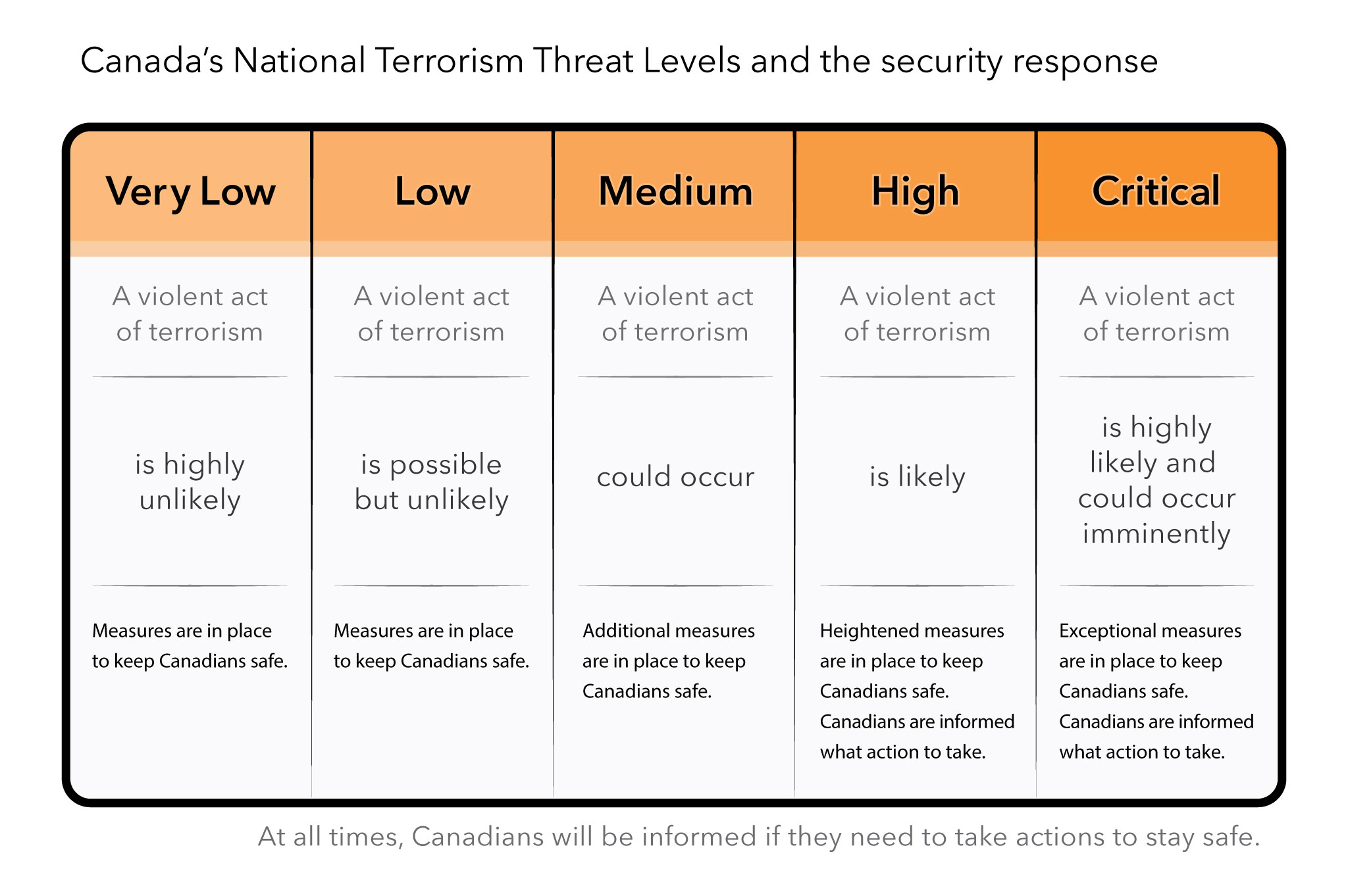 Canada's threat levels do not require specific responses from the public. Rather, threat levels help law enforcement and government agencies and private sector stakeholders to identify risks and vulnerabilities from threats and, in turn, determine appropriate responses to prevent or mitigate a violent act of terrorism.