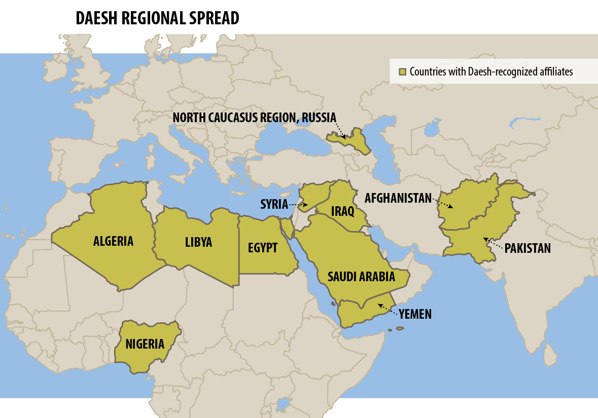 This is a map depicting Daesh's regional spread in Africa, Asia, and Europe. Several countries have been highlighted as having Daesh-recognized affiliates. These are Syria, Iraq, Algeria, Libya, Egypt, Saudi Arabia, Yemen, Afghanistan, Pakistan, Nigeria, and the North Caucasus Regions of Russia.