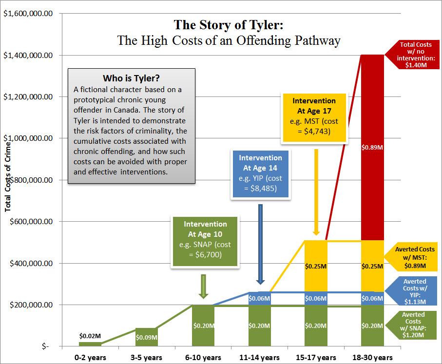 This chart illustrates the escalating costs associated with Tyler's offending trajectories, broken down by age range. Tyler is a fictional character based on a prototypical chronic young offender in Canada. Tyler's story is meant to demonstrate the risk factors of criminality, the cumulative costs associated with chronic offending, and how such costs can be avoided with proper and effective interventions.