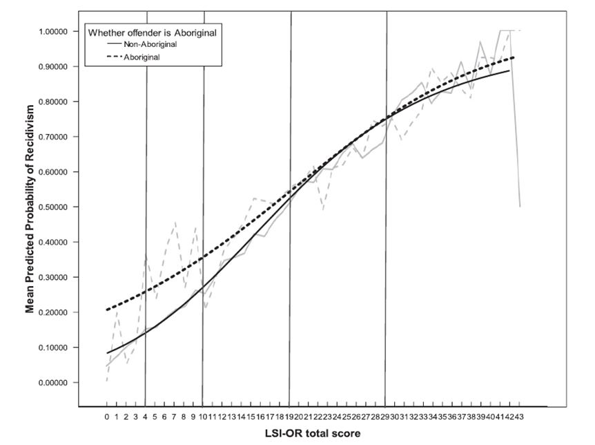 Wilson and Gutierrez (2014) also examined the calibration of the LSI (Ontario revision) in a single sample of 1,692 Indigenous offenders and 24,758 non-Indigenous offenders from Wormith and Hogg (2012). Following Reynolds (2000), this study computed separate logistic regression equations (intercept, slope) for the two groups. As seen in Figure 1, the recidivism rates predicted from the LSI-OR were well-calibrated for moderate and high scoring Indigenous offenders, but underestimated the absolute recidivism rates of low scoring Indigenous offenders. In other words, recidivism rates for Indigenous offenders with low scores on the LSI-OR were higher than what would be predicted by the risk scale. This suggested that actuarial risk scales may actually under-classify Indigenous offenders.