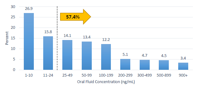“Most interestingly, over half (57.4%) of THC-positive drivers had a THC concentration sufficient to have triggered a positive result on ADSE – i.e., at least 25 ng/ml. In an enforcement setting, a positive ADSE result could lead to further investigation such as a demand to participate in a Standardized Field Sobriety Test (SFST), evaluation by a Drug Recognition Expert, and/or a blood test. Extremely high oral fluid THC concentrations are often indicative of very recent use, possibly just prior to – or during -- driving.” (CCMTA, 2019: 14)