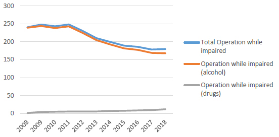 Statistics Canada’s 2016 Juristat on Impaired Driving (Perreault, 2016) had indicated that the rate of impaired driving incidents cleared by charge was generally declining: it was almost 90% in 1989, and about 71% in 2015. Data from 2018 confirm the trend with approximately 63% of impaired driving incidents cleared by charge. Furthermore, 2015 data show that fewer drug-impaired driving incidents led to criminal charges (59%) than alcohol-impaired driving incidents; the proportion was 57% in 2018. This may be due in part to increased use of administrative sanctions as opposed to criminal charges, as well as the challenges associated with investigating and prosecuting a drug-impaired driving offence, as previously discussed.
