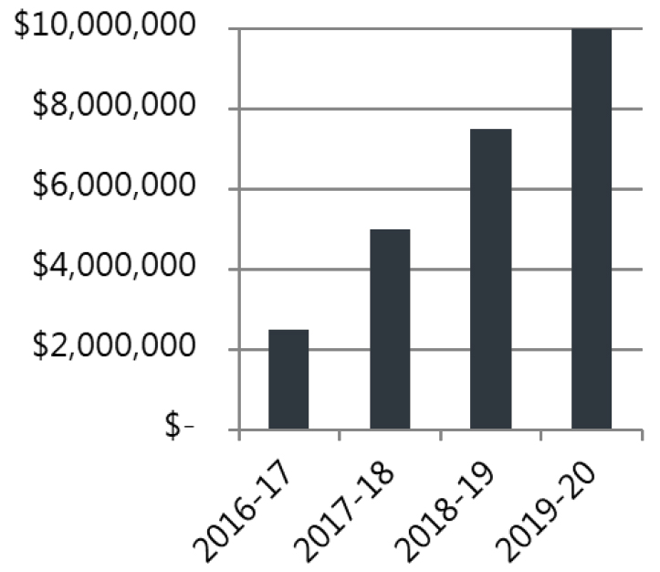 Figure 1 illustrates the Treasury Board allocated funding for the Canada Centre identified in Budget 2016. Total funding by fiscal year is as follows: $2.5 million in 2016-17; $5 million in 2017-18; $7.5 million in 2018-19; and, $10 million in 2019-20.
