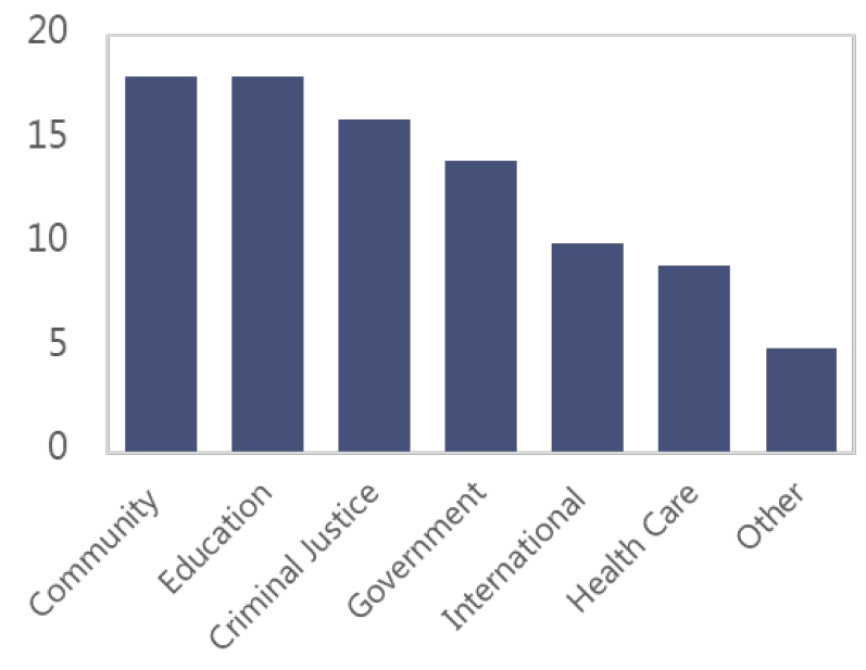 community-serving/not for profit organizations (18), education (18), criminal justice system (16), other government stakeholders (14), international partnerships (10), health care (9), and other sectors (5), which included media and technology and faith-based organizations.