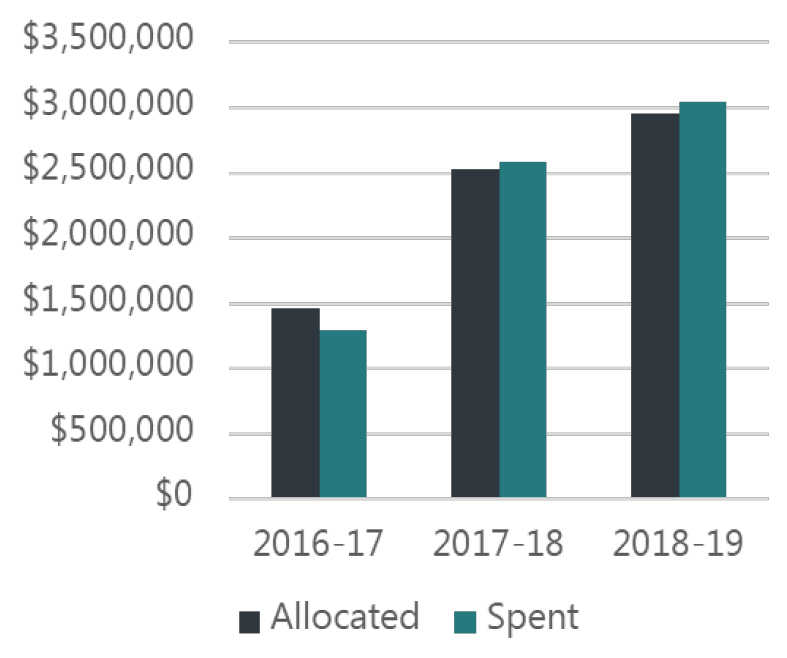 Figure 3 illustrates the Canada Centre’s actual operating expenditures by fiscal year compared to the amount allocated for operating expenditures for the same fiscal year. The amounts allocated and spent by fiscal year are as follows: 2016-17 – $1,466,407 (allocated) and $1,295,730 (spent); 2017-18 – $2,532,312 (allocated) and $2,590,410 (spent); and, 2018-19 – $2,955,124 (allocated) and $3,043,399 (spent).