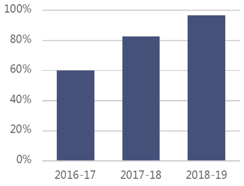 One measure of efficiency for G&Cs programming is the success in getting funding out the door (see Figure 4). Based on this measure, the CRF has improved over time. In its first year, FY 2016-17, 60% of funding budgeted for G&Cs (Vote 5) was spent, which increased to 83% in FY 2017-18 and to 97% in FY 2018-19.