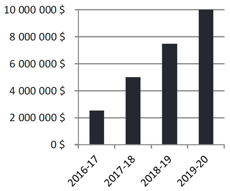 La première figure démontre les fonds alloués par le Conseil du Trésor pour le Centre canadien établi dans le budget de 2016. Le total de fonds par année fiscale est le suivant : 2,5 M$ en 2016-2017; 5 M$ en 2017-2018; 7,5 M$ en 2018-2019; et 10 M$ en 2019-2020.