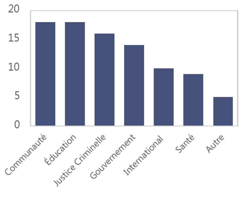 La deuxième figure démontre le secteur de partenaires désignés pour les projets financés par le Centre canadien. Les secteurs désignés et les le nombre de partenaires correspondant sont les suivants : Communauté (18 partenaires); Éducation (18 partenaires); Justice criminelle (16 partenaires); Gouvernement (14 partenaires); International (10 partenaires); Santé (9 partenaires); Autre (5 partenaires).