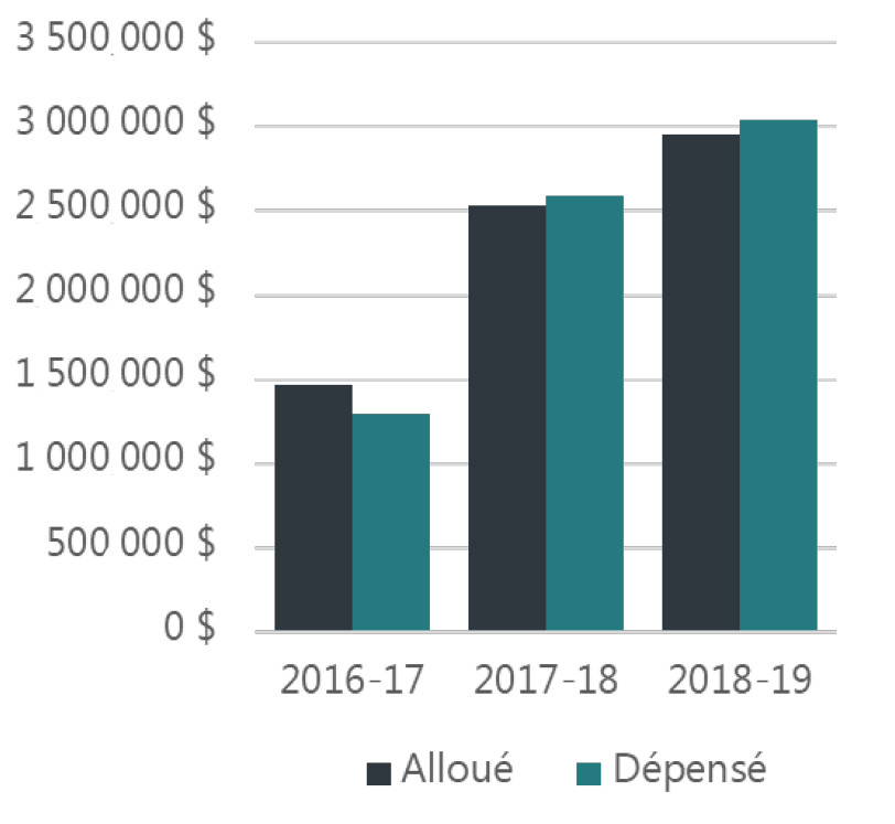 La troisième figure démontre les dépenses relatives au fonctionnement du Centre canadien par année fiscale, comparé au montant alloué pour les dépenses relatives au fonctionnement pour la même année fiscale. Les montants alloué et dépensé sont les suivants : 2016-2017 -- 1 466 407 $ (alloué) and 1 295 730 $ (dépensé); 2017-2018 – 2 532 312 $ (alloué) and 2 590 410 $ (dépensé); and, 2018-2019 – 2 955 124 $ (alloué) and 3 043 399 $ (dépensé).