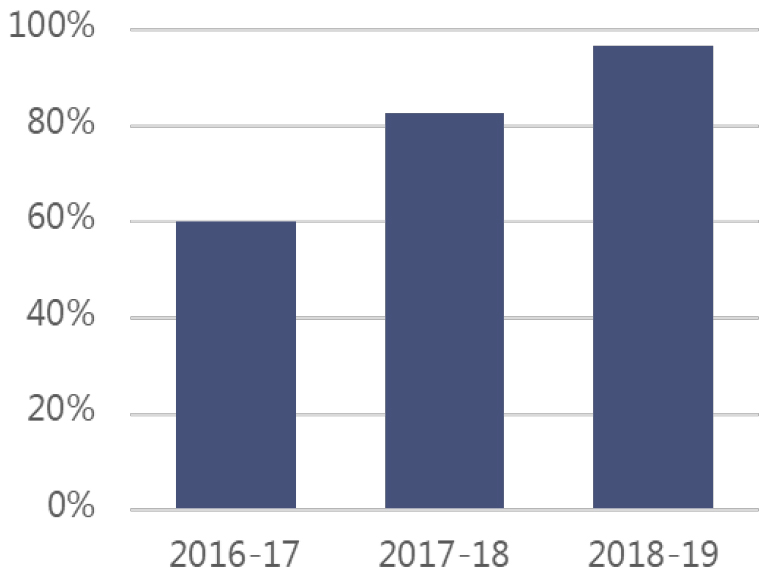 Une mesure de l’efficacité des programmes de subventions et de contributions correspond à la distribution réussie du financement (voir Figure 4). Selon cette mesure, le FRC a connu une amélioration au fil du temps. Au cours de sa première année d’existence, pendant l’exercice 2016-2017, 60 % du financement prévu pour les subventions et les contributions (crédit 5) a été dépensé. Ce pourcentage est passé à 83 % pour l’exercice 2017-2018 et à 97 % pour l’exercice 2018-2019.