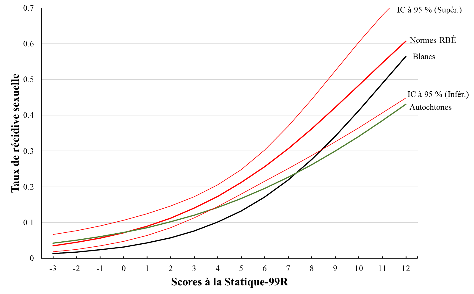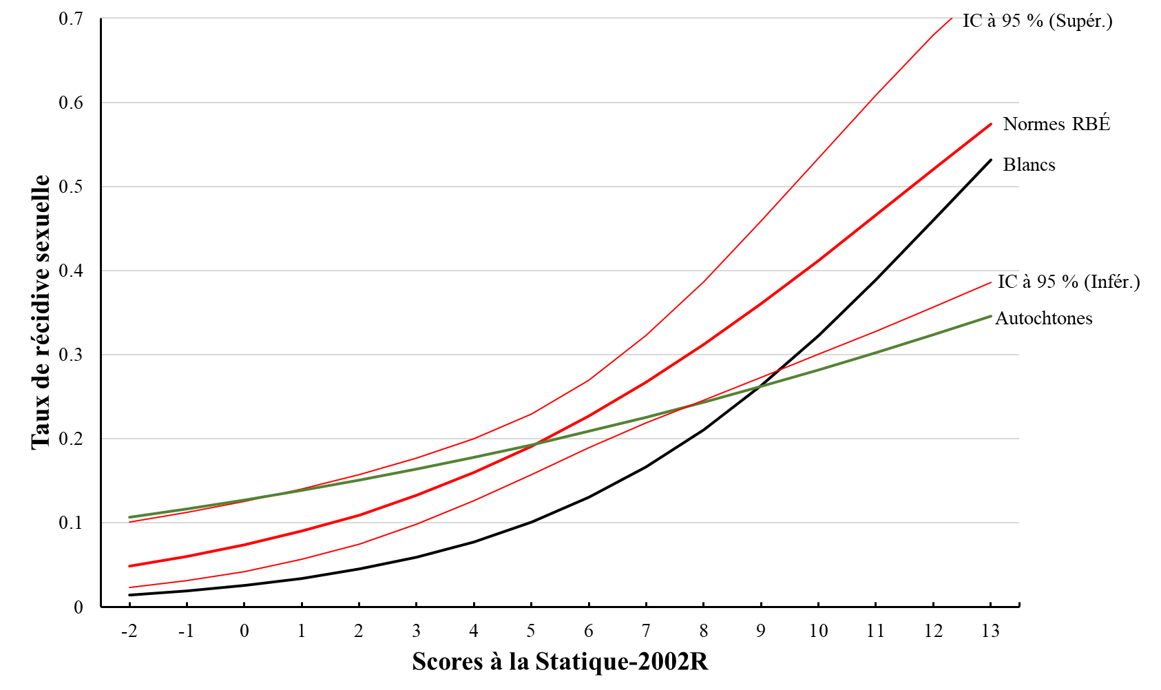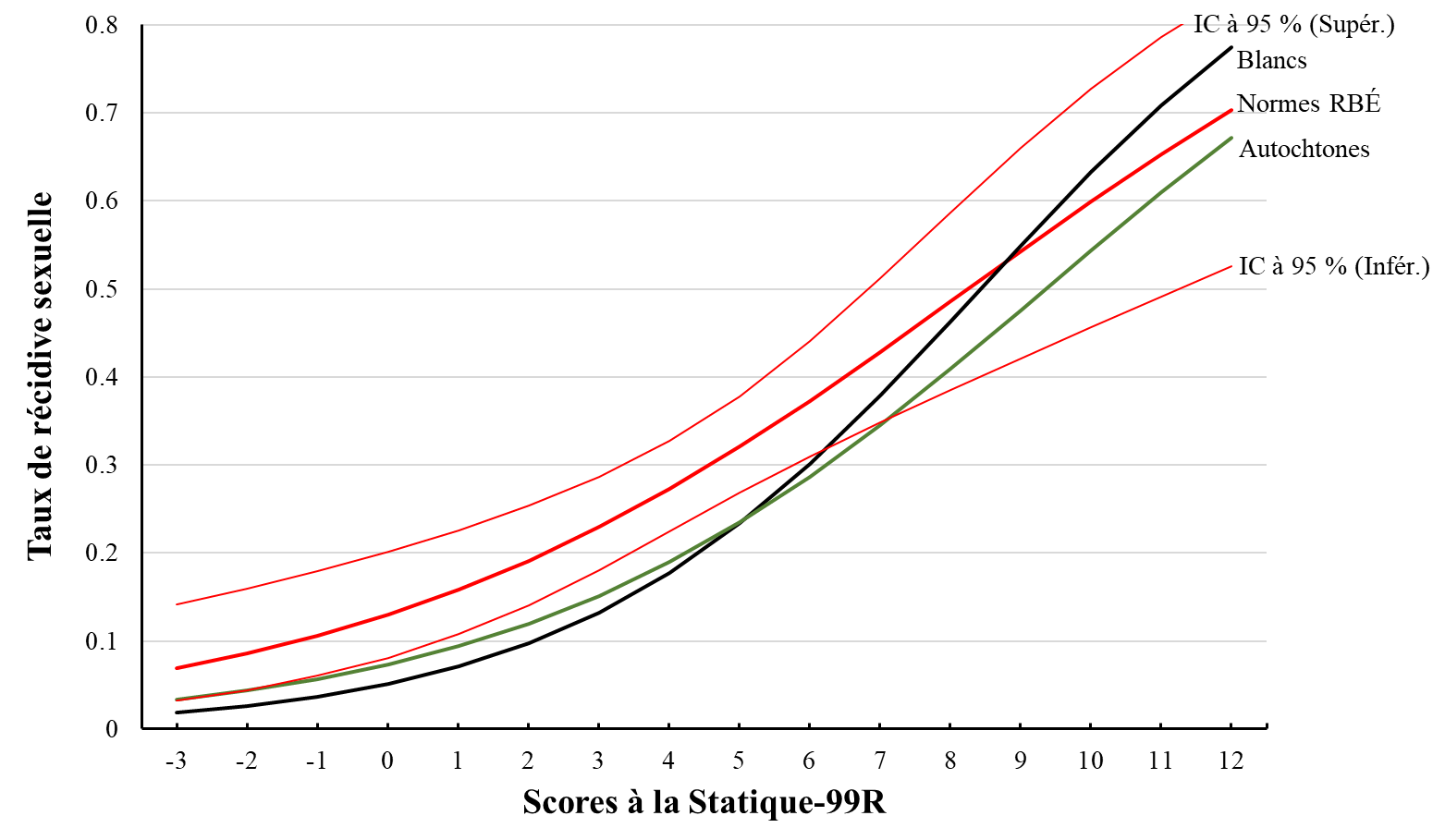 Une seule étude examine la validité prédictive (discrimination) de la Statique-99R et de la Statique-2002R en ce qui concerne les Autochtones au Canada. Babchishin et ses collègues (2012) ont examiné la validité prédictive des deux échelles auprès de 1 588 personnes ayant des antécédents de crimes sexuels (Autochtones, n = 319; non-Autochtones, n = 1 269). En général, ils ont observé une discrimination modérée entre les récidivistes et les non-récidivistes dans les deux groupes pour la Statique-99R (récidive sexuelle; valeur AUC de 0,71 pour les Autochtones et de 0,74 pour les non-Autochtones). La Statique-2002R, en revanche, était significativement moins efficace pour prédire la récidive sexuelle chez les Autochtones que chez les non-Autochtones. En effet, les scores totaux à la Statique-2002R ne prédisaient pas de manière significative la récidive sexuelle chez les Autochtones ayant des antécédents de crimes sexuels (valeur AUC de 0,61 vs 0,76 pour les non-Autochtones). Cette étude n'évaluait pas l'étalonnage de la Statique-99R ou de la Statique-2002R.