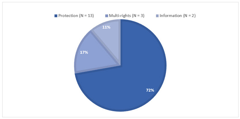 The graph shows that 72% of the admissible complaints where in regard to the Right to Protection, 17% were about multiple rights of victims, and 11% were in regard to the Right to Information.