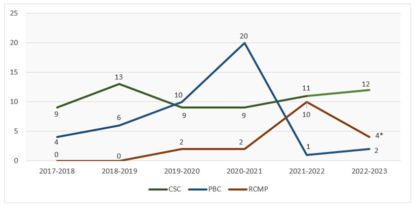 Figure 4 below illustrates the fluctuations in complaints that met admissibility criteria by fiscal year. For example, in 2020-2021, the PBC had the largest influx of complaints (n=20). During this period, almost half of those complaints (8 of 20) were related to limited public access to CSC institutions due to the COVID-19 public health restrictions, which resulted in PBC suspending/limiting in-person victim and observer attendance at parole hearings. Also, over time it may appear that the number of CVBR complaints to the RCMP had increased; however, we attribute this to concerted effort by the RCMP to increase rigor in identifying and addressing CVBR complaints.