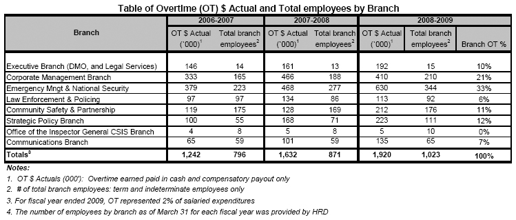 Public Safety Canada administers leave and overtime for approximately 1000 employees. In 2008-09, approximately 30,000 days of leave were taken by employees and actual overtime expenditures were $1.9M, representing approximately 2% of total salary expenditures (approximately $84M).