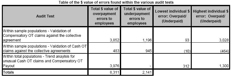 Limited operational procedures existed to guide the Compensation Advisors in processing leave and OT transactions, which contributed to a material number of errors with regard to OT transactions including, incorrect posting of hours into the system, double entry for hours in the same period, misinterpretation of Collective Agreement conversion rate factors, and inappropriate exercising of Section 34 of the Financial Administration Act. Generally, the dollar value of these errors was material in regard to the specific OT expenditures based on a materiality guideline of 1% of the OT population’s actual expenditures for the audited period. Such errors may be an indication of other qualitative impacts such as the hardship and frustration to employees caused by the subsequent recovery of any overpayment, or the potential of additional errors beyond the scope of OT transactions as many of these same procedures and controls are used in processing general payroll.