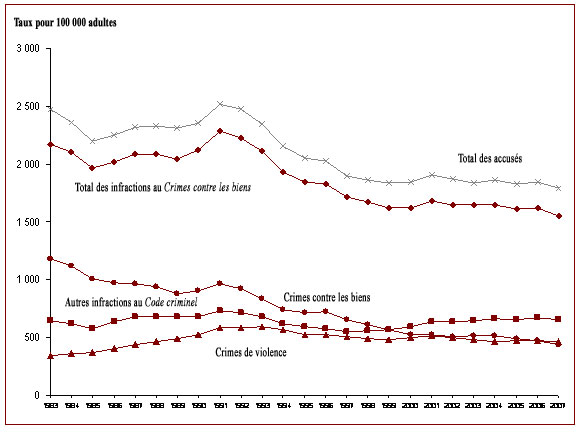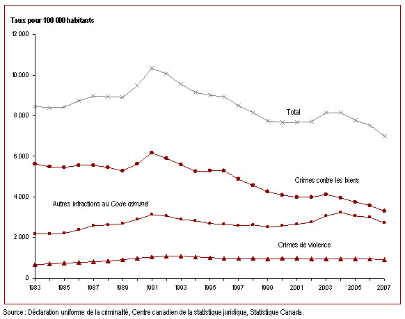 - En 2007, le taux de crimes contre les biens était 41 % moindre qu'en 1983 et inférieur de 46 % à son plus haut niveau atteint en 1991.
