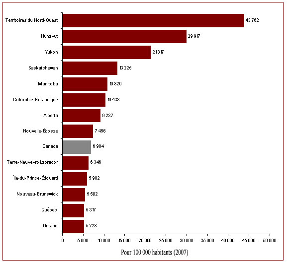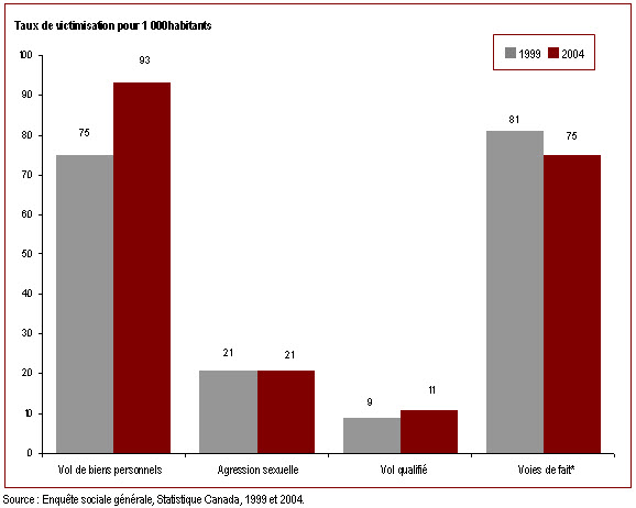 Ces statistiques sur la criminalité sont basées sur les crimes qui sont signalés à la police. Vu que les crimes ne sont pas tous signalés à la police, ces chiffres sont en deçà de la réalité. Voir à la figure A6 les taux calculés d'après les résultats d'une enquête sur la victimisation (l'Enquête sociale générale); il s'agit là d'une autre façon de mesurer la criminalité.