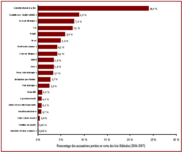 - Les accusations relatives à l'administration de la justice représentent 24 % des accusations portées devant les tribunaux pour adultes
