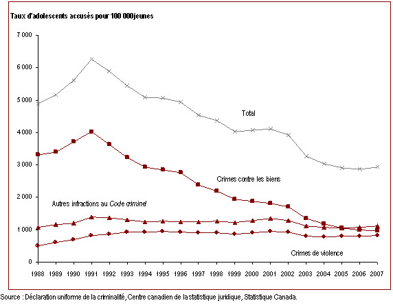 - Le taux de jeunes inculpés a atteint un sommet en 1991; depuis, il ne cesse de diminuer