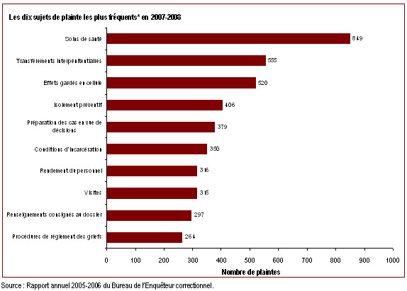 - Les soins de santé est le sujet sur lesquel les délinquants sous responsabilité fédérale portent le plus souvent plainte au Bureau de l'Enquêteur correctionnel