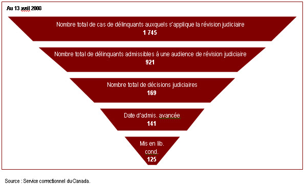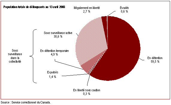 - Au 13 avril 2008, il y avait 394 délinquants dangereux qui purgent encore une peine, dont 374 sont en détention (ce qui représente 2,8 % de la population carcérale sous responsabilité fédérale), un a été expulsé du pays et 19 sont sous surveillance dans la collectivité.