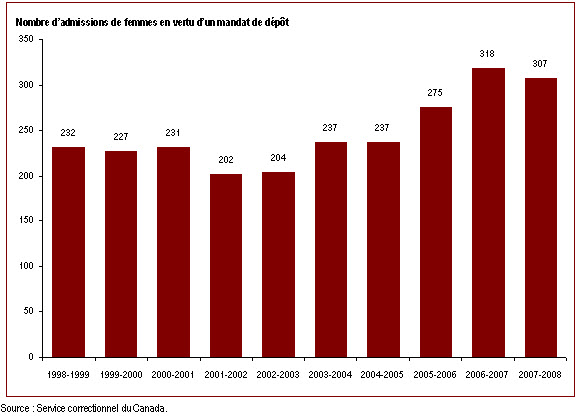 - Le nombre d'admissions de femmes dans les établissements fédéraux en vertu d'un mandat de dépôt a augmenté au cours de la dernière décennie