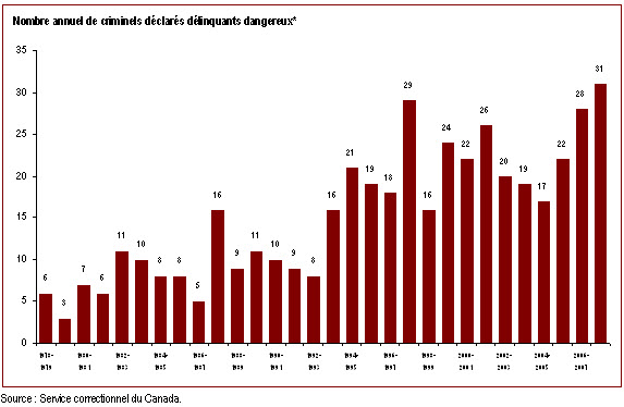 - Au 13 avril 2008, il y a eu 455 criminels déclarés délinquants dangereux depuis 1978.