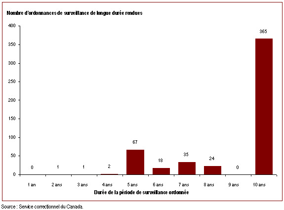 - Au 13 avril 2008, les tribunaux avaient rendu 513 ordonnances de surveillance de longue durée, dont 71,2 % imposaient une période de dix ans.