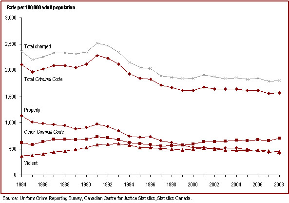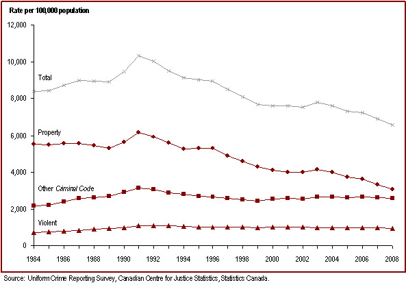- The crime rate, since peaking in 1991, continues to decline. In 2008, the crime rate was the lowest recorded in the last 25 years.