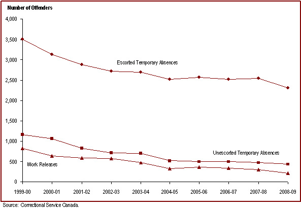 - The number of offenders granted temporary absences has decreased since 1999-00