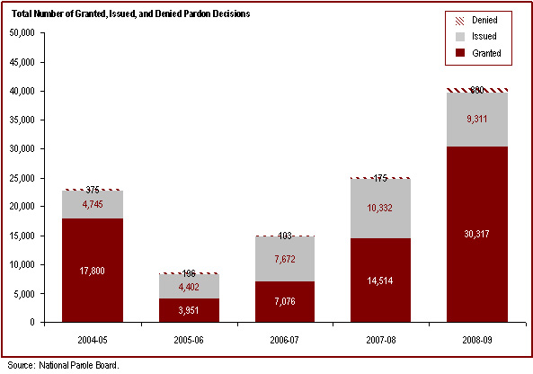 - The number of pardon applications processed increased from 25,021 in 2007-08 to 40,428 in 2008-09.