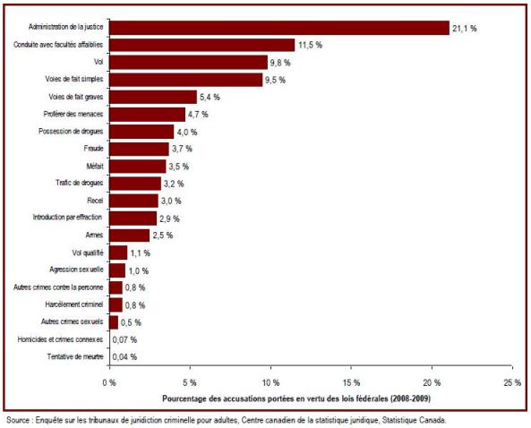 - Les accusations relatives à l'administration de la justice représentent 21 % des accusations portées devant les tribunaux pour adultes
