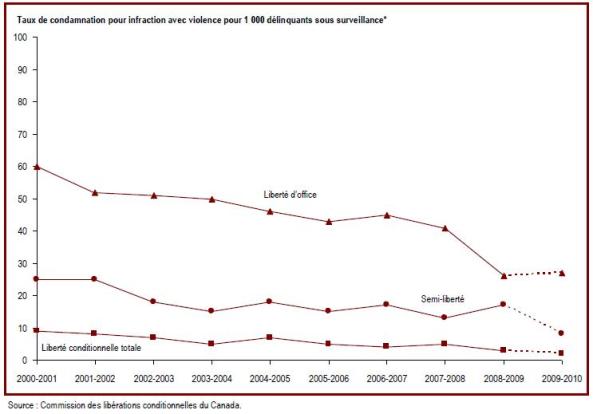 - Au cours des dix dernières années, le taux de condamnation pour une infraction avec violence chez les délinquants sous surveillance a diminué