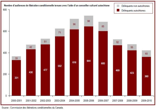 - Le nombre d'audiences de libération conditionnelle avec l'aide d'un conseiller culturel autochtone a diminué pour une quatrième année de suite