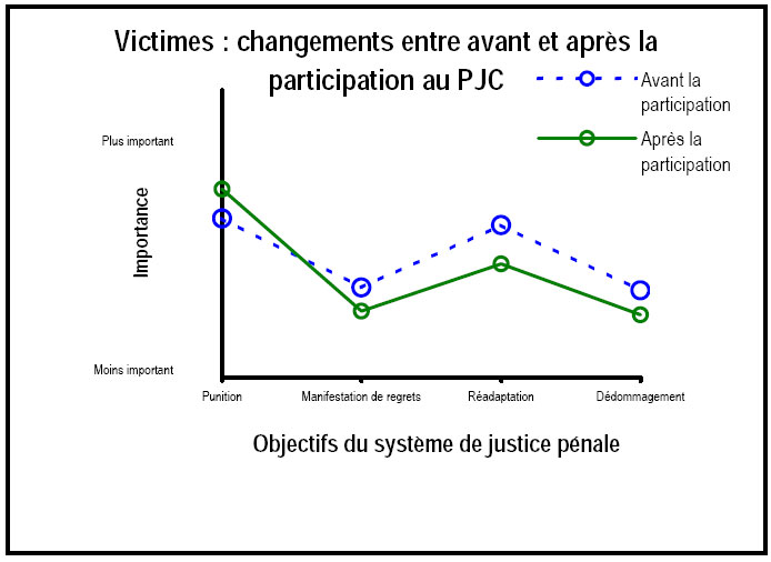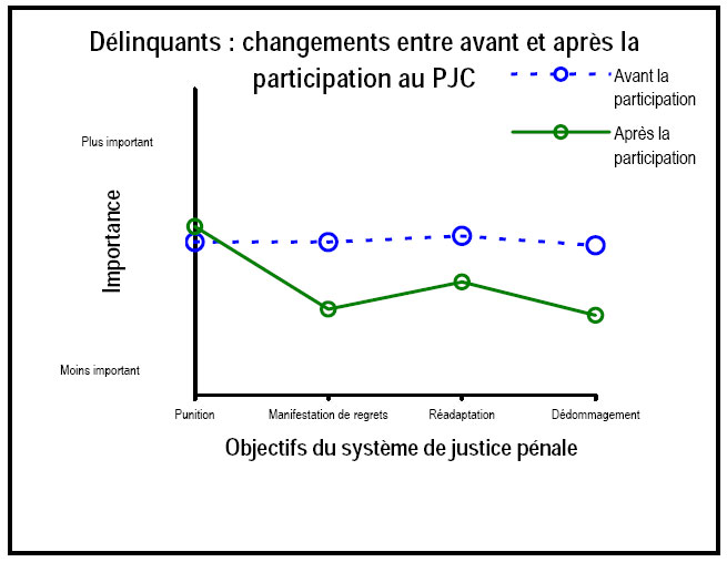 L'examen du changement survenu chez les participants au PJC montre qu'un grand nombre des variables mesurées n'ont pas changé pendant la durée du processus. Plus particulièrement, on n'a constaté aucune modification significative quant aux remords manifestés par le délinquant, à l'intensité de la peur ressentie par les victimes, aux attitudes à l'égard du système de justice pénale et à l'importance accordée aux objectifs de la justice réparatrice. Le peu de changement survenu dans l'importance accordée aux objectifs de la justice pénale n'est guère surprenant, car n'y a pas vraiment lieu de croire que la participation à une approche fondée sur la justice réparatrice peut avoir une incidence sur les attitudes à l'égard de ce que les participants considèrent peut-être comme un système « distinct ». Pour garantir la fiabilité des résultats, il faudrait mener d'autres recherches afin de préciser ce qu'on entend par « système traditionnel de justice pénale », particulièrement si la définition englobe les expériences personnelles du client avec le système traditionnel et avec l'approche de justice réparatrice, ou si les participants doivent voir le système traditionnel comme étant un système distinct (avec lequel ils n'ont pas eu affaire).