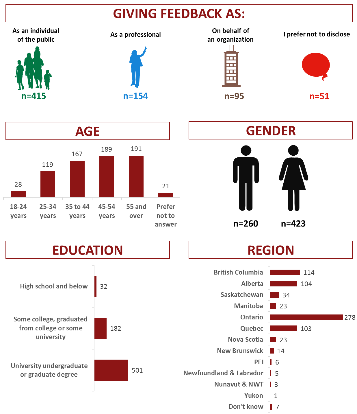 As noted above, the profile of contributors is not representative of all Canadians and does not represent the perspectives of the broader general public, or all organizations or professionals. This report represents the views of interested contributors and should be considered as a directional source of feedback, priorities and ideas related to this issue.