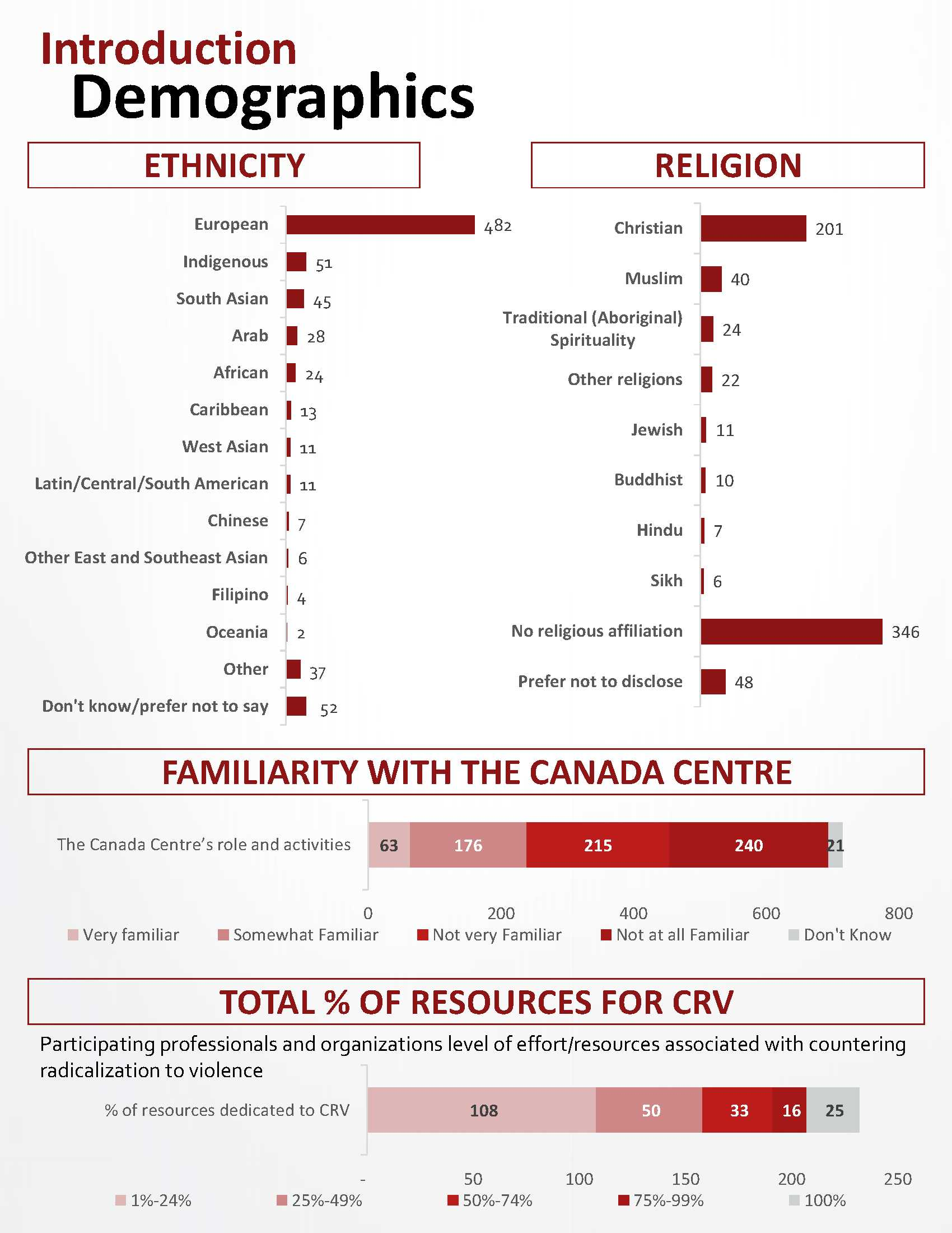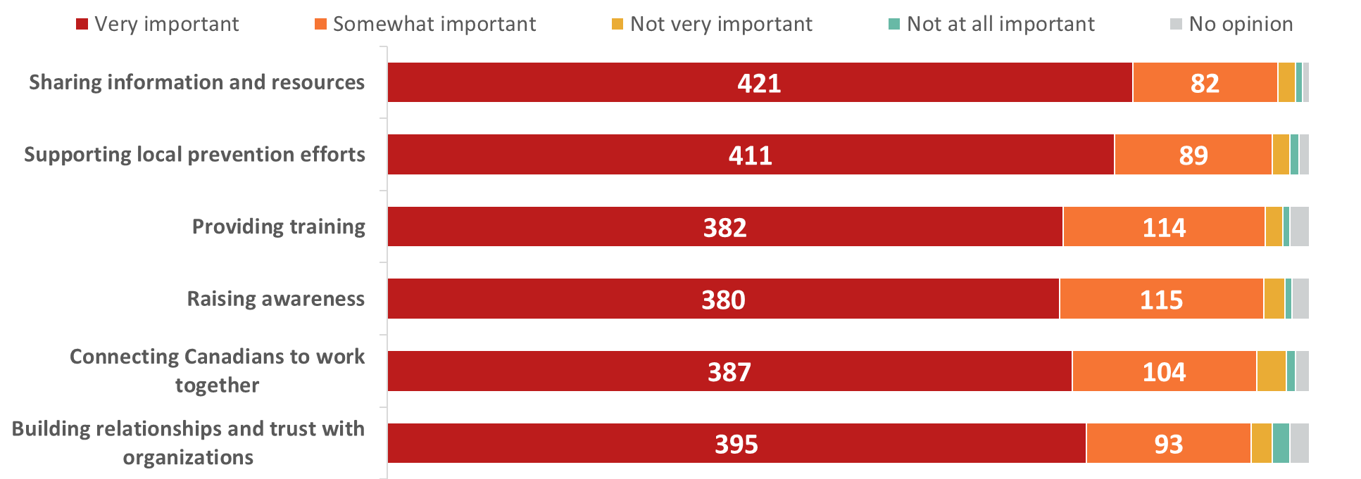 The identification of people and organizations with important roles in addressing radicalization to violence in Canada, along with how they can and do work together (e.g. law enforcement, health and social services, education, community-based organizations, etc.) was also viewed as an important focus of the Canada Centre. This was most important to respondents who identified as professionals and organisations with more than 75% of their time/resources devoted to countering radicalization to violence.